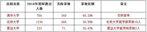 从上图我们不难看出,北京大学和复旦大学自主招生的录取比例和2015年相比有所提升,清华大学虽然录取比例相比2015年有所下降,但是初审通过人数和录取人数比2015年有所增加。复旦大学和北京大学医学院自主招生人数虽然不多,但比起2015年还是有所增加。