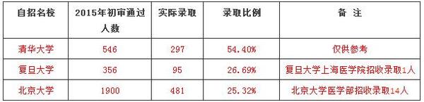 2015全国高校自主招生报名初审通过数据及自主招生录取比例: