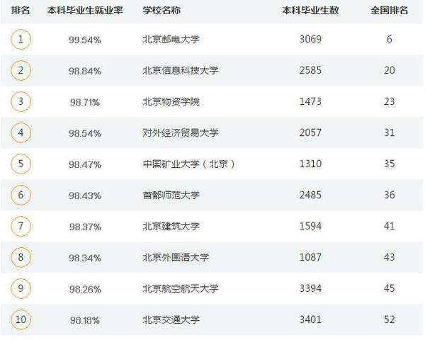 高校所在地区对就业也有着很重要的影响,根据2015年毕业生的就业数据统计北京地区高校的就业排行榜,出人意料的是,在2015年的就业率前十名中竟然没有清华北大,这个可能是由于清华北大出国以及深造的比例比较高因此就业率较低导致的。那么,霸占北京高校就业率排行榜第一名的高校是谁呢?今天,我们就来解密以就业率99.54%博得榜单榜首的北京邮电大学。
