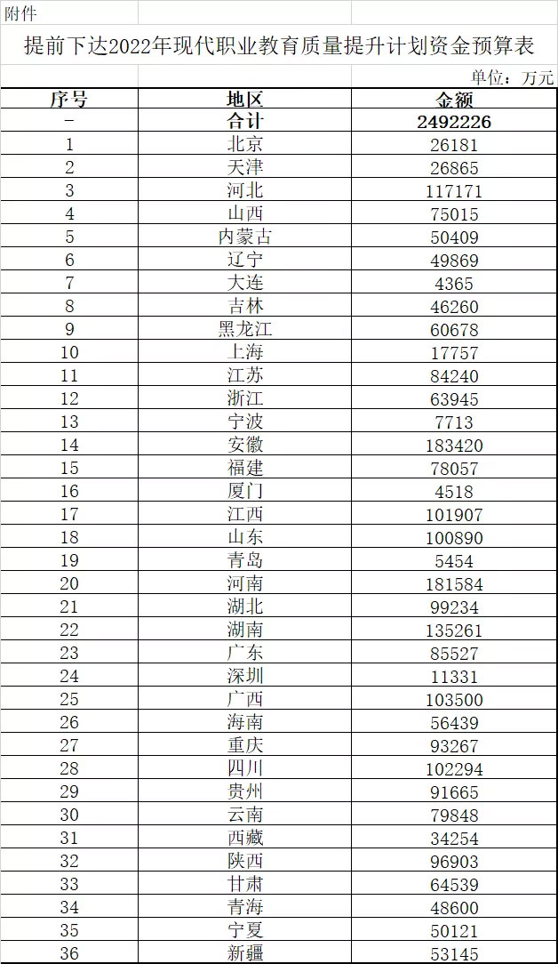 近日,《财政部 教育部关于提前下达2022年现代职业教育质量提升计划资金预算的通知》印发,《通知》要求,各地要认真落实中共中央办公厅、国务院办公厅印发的《关于推进现代职业教育高质量发展的意见》、《国务院关于印发国家职业教育改革实施方案的通知》(国发〔2019〕4号)等确定的各项改革任务,深化产教融合、校企合作,按要求支持推行“学历证书+职业技能等级证书”制度、支持实施中国特色高水平高职学校和专业建设计划等。在分配相关资金时,要结合实际向困难地区和薄弱环节倾斜,向办学质量高、办学特色鲜明的职业院校倾斜。做好与发展改革部门安排基本建设项目等资金的统筹,防止资金、项目安排重复交叉。