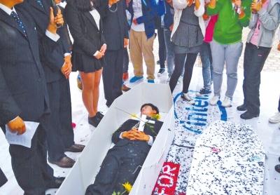 10月20日中午,伴随着东极岛之歌,该社团十几名身着黑衣、手举黑伞的学生冒雨在钟楼广场上,围着因24小时不间断玩游戏而猝死在电脑前的同学“李二蛋”进行哀悼。