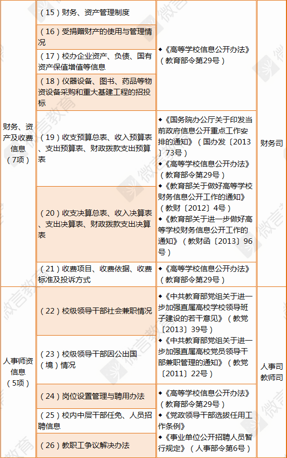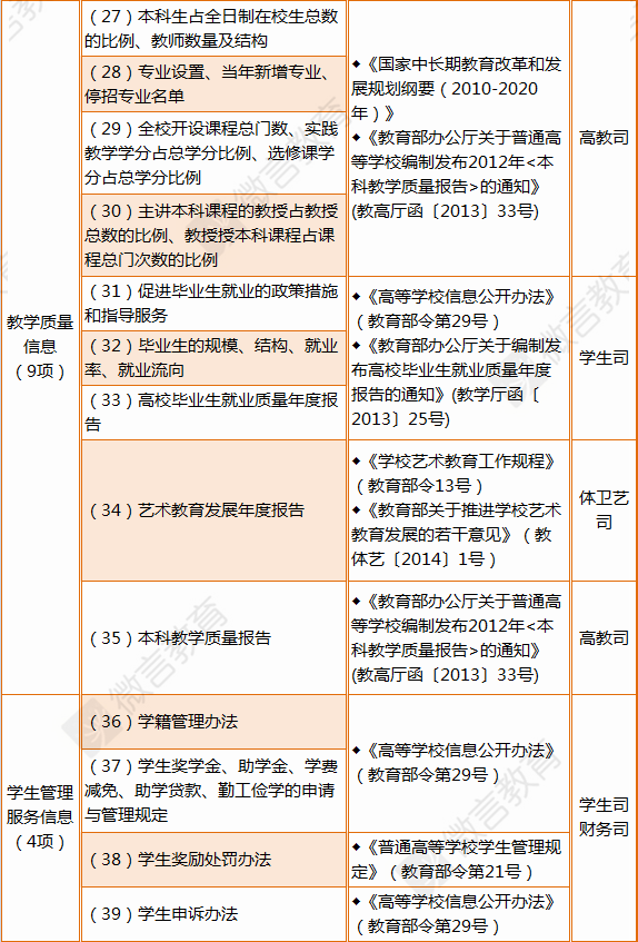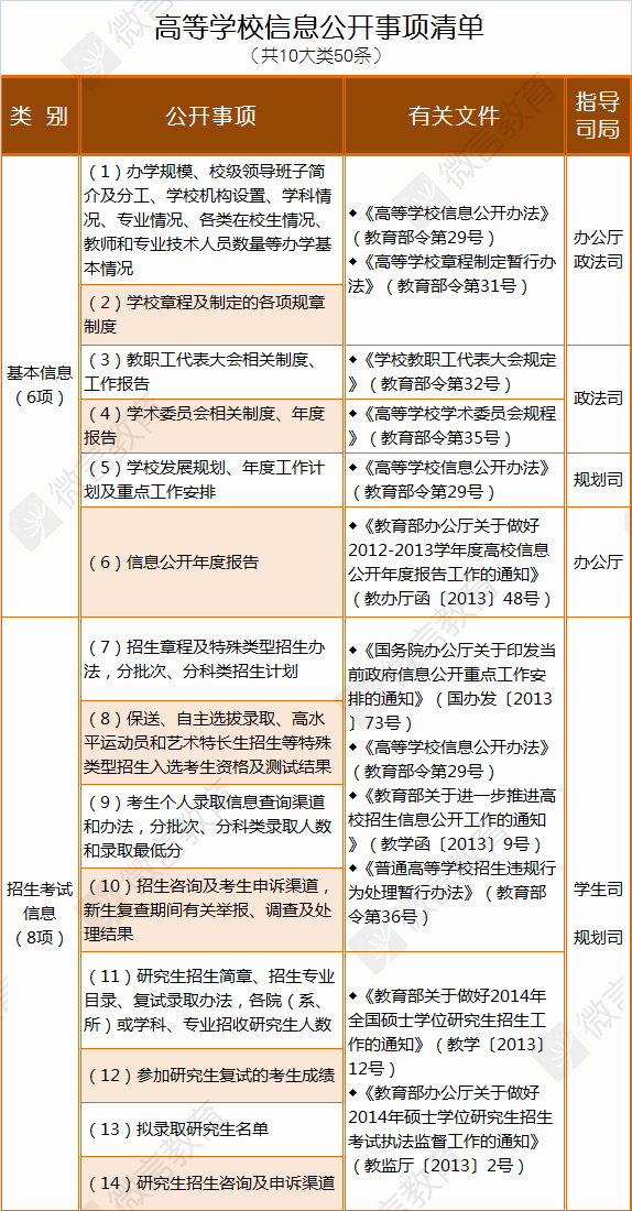 今年7月底,教育部发布《高等学校信息公开事项清单》。《清单》要求,高校面向社会主动公开的事项,包括基本信息、招生考试信息、财务资产及收费信息、人事师资信息、教学质量信息、学生管理服务信息、学风建设信息、学位学科信息、对外交流与合作信息和其他信息等10个大类50条具体项目,应当在清单信息制作完成或获取后20个工作日内公开;年度报告应当于每年10月底前向社会公布。