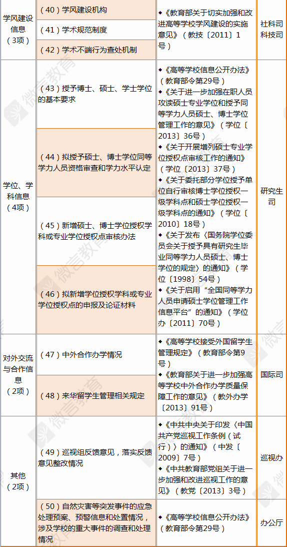 10个大类50条具体项目的《清单》基本覆盖了高校应主动向社会公开的内容,是对《高等学校信息公开办法》主动公开内容的细化和深化。教育部办公厅负责人表示,50条清单均是具体指标,既可以按条督查高校是否做到公开,又可以清单为基础设计指标体系开展测评,便于公开、便于评测、便于督查。